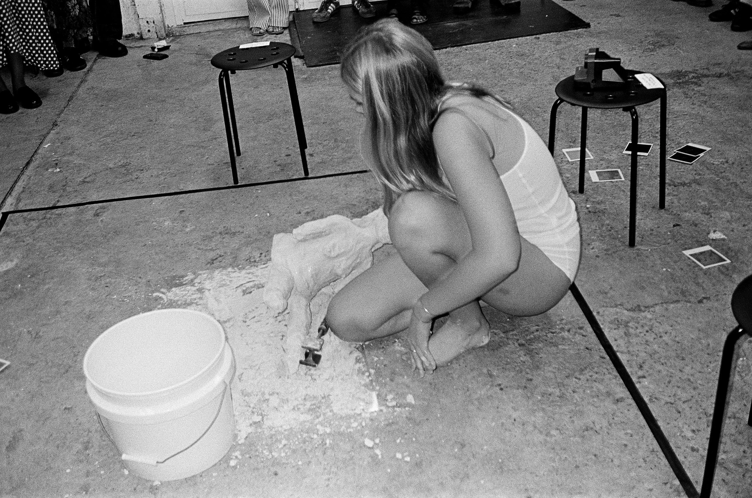 RE-MAKING is a multi-media installation performance that seeks to materially explore the processes through which humans form their subjectivity in the presence of others. The performative aspect of the piece consists of the artist (myself) slowly deconstructing a clay sculpture made to resemble me, using a hammer and a basin of water. The installation component involves the use of six polaroid cameras lining the delineated portion of space occupied by the artist. In order to materially simulate and capture the act of “witnessing” involved in subject formation, the audience is asked to move freely about the space and click the buttons of the polaroids throughout the duration of the exhibition. By the end of the performance, the ground is littered with photographic representations of being-seen-through-another’s-eyes during a hyper-real and embodied interpretation of “forming the self” – or in this case, an attempt to de-form in order to re-form.
